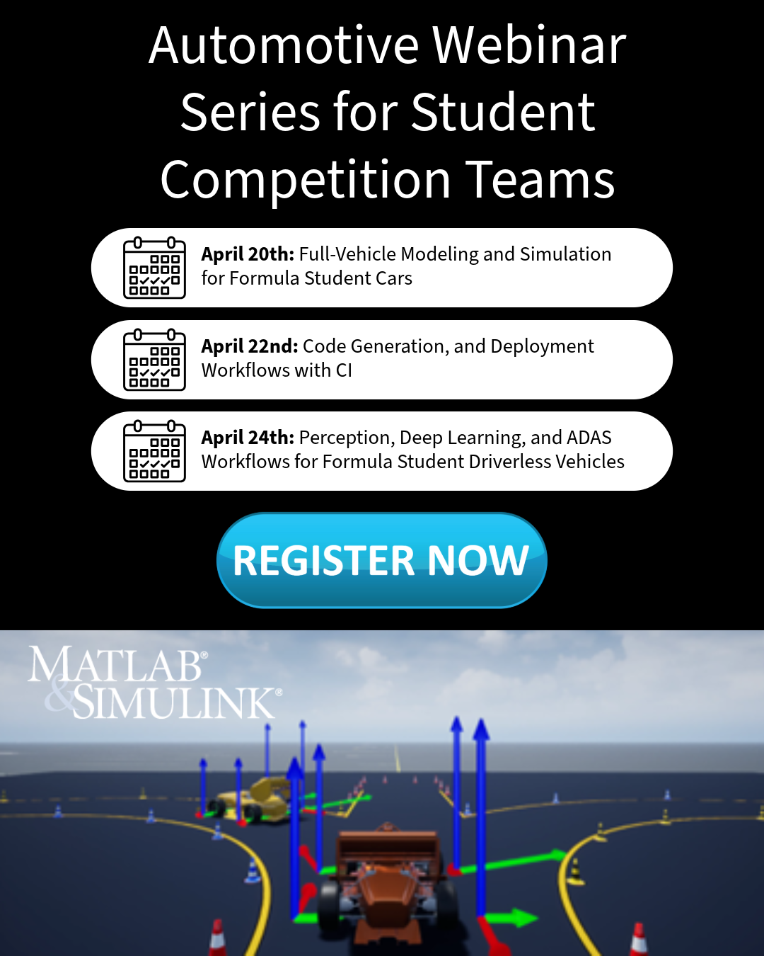 This April, MathWorks is hosting a free Automotive Online Webinar Series designed specifically for Formula Student and Formula Student Driverless teams. The series showcases end‑to‑end automotive and driverless workflows using MATLAB and Simulink, from early concept modeling through to production‑oriented deployment.