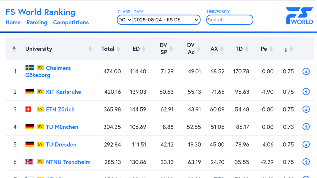We're excited to announce the official release of the Formula Student World Ranking List with its new formula at fs-world.org! Alongside this update, the Driverless Cup (DC) is now part of the Formula Student World Ranking List for the first time, next to the already existing EV and CV classes.